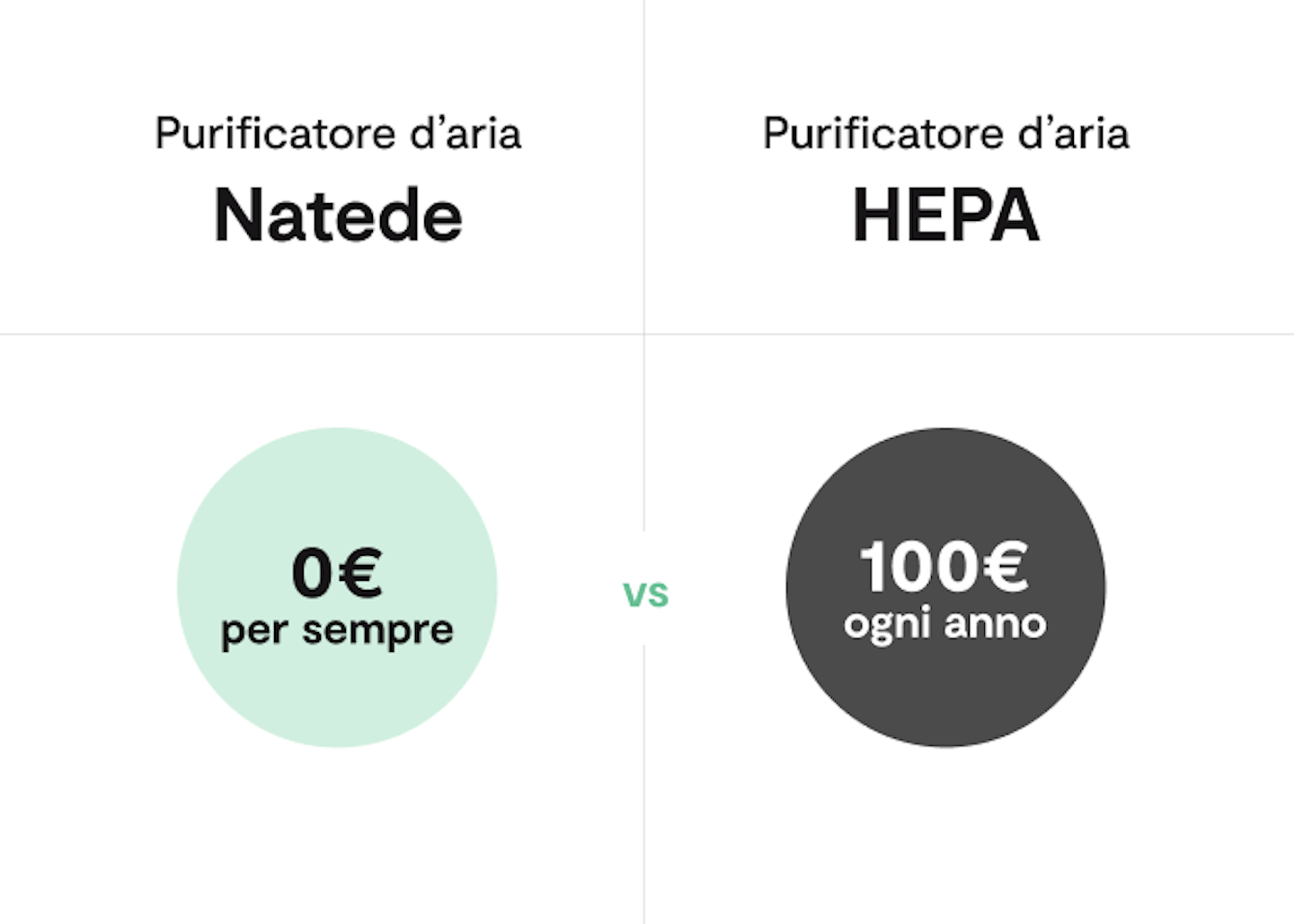 Risparmiando fino a 100€ all'anno in cambio filtri per purificatori HEPA costosi, ingombranti e che sprecano risorse.